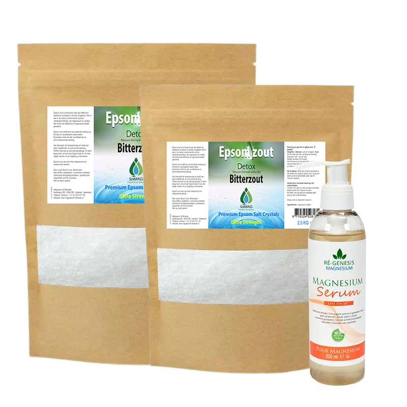 Dit pakket bestaat uit 5 kg magnesiumsulfaat en 200 ml magnesium serum.
